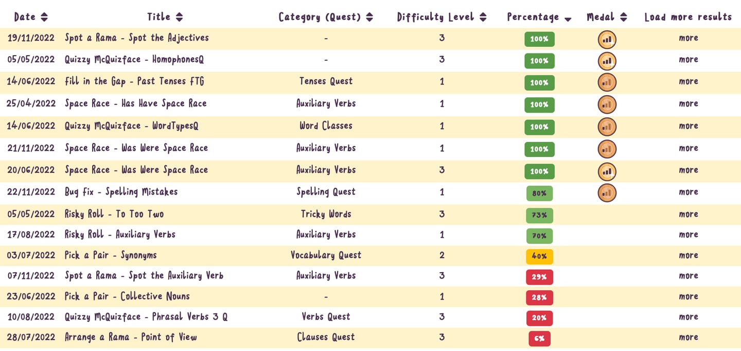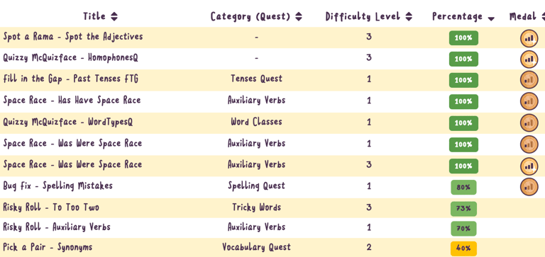 Yes - teachers can track usage and performance with various tools — from simple at-a-glance headlines, to detailed, searchable data. In Teacher Dashboard, see: Progress Tracking, Results, Roll of Honour, Trophies, School Stats, Activity Reports
