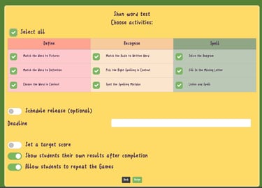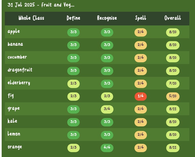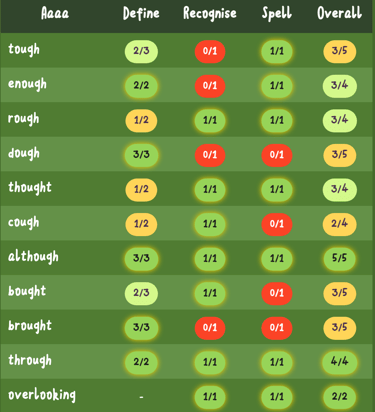 After students have played your games, you can see an intuitive 'at-a-glance' whole class overview, to see which words your class have mastered.