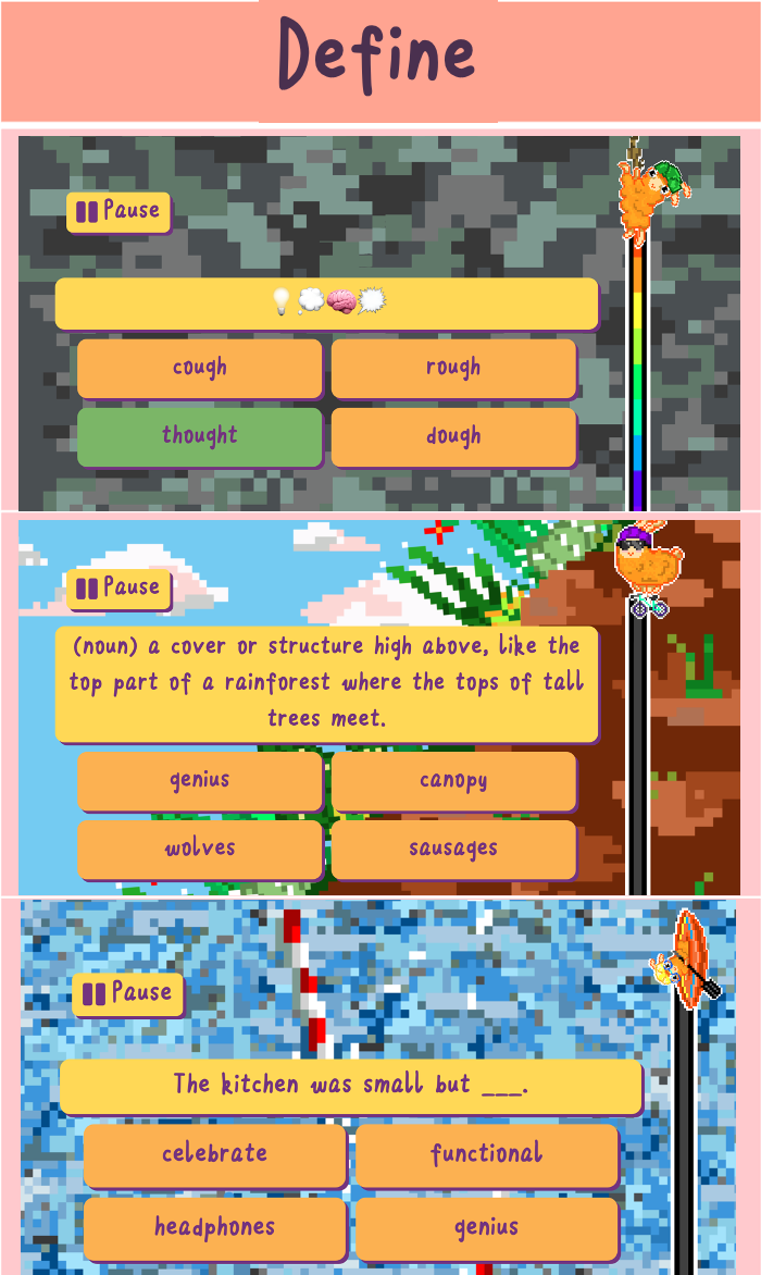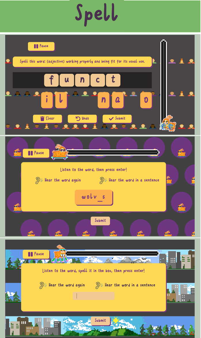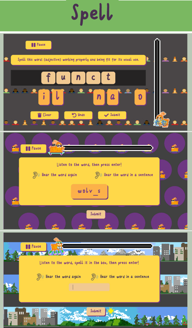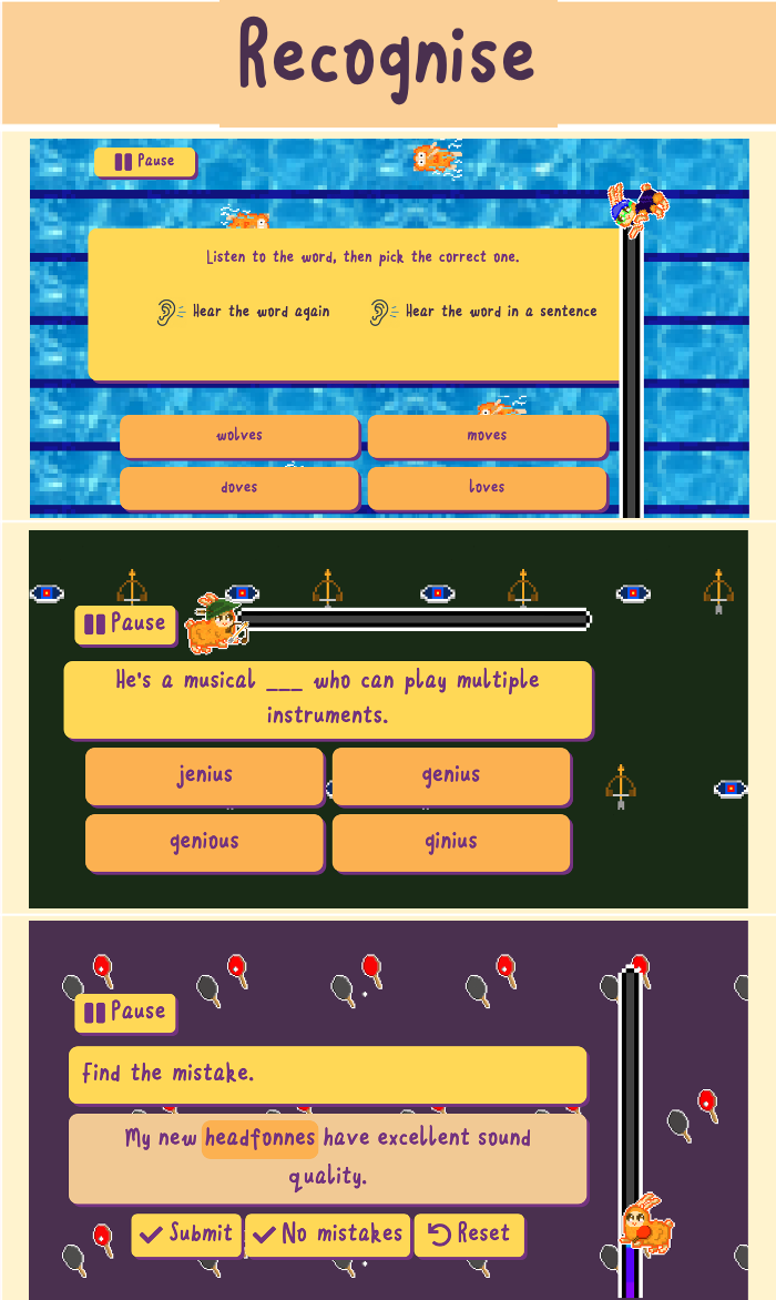 We've designed an audio matching game where students identify the word amongst others with similar morphology. We give plausible misspellings to help students focus on correct patterns, with instant feedback for right and wrong answers.