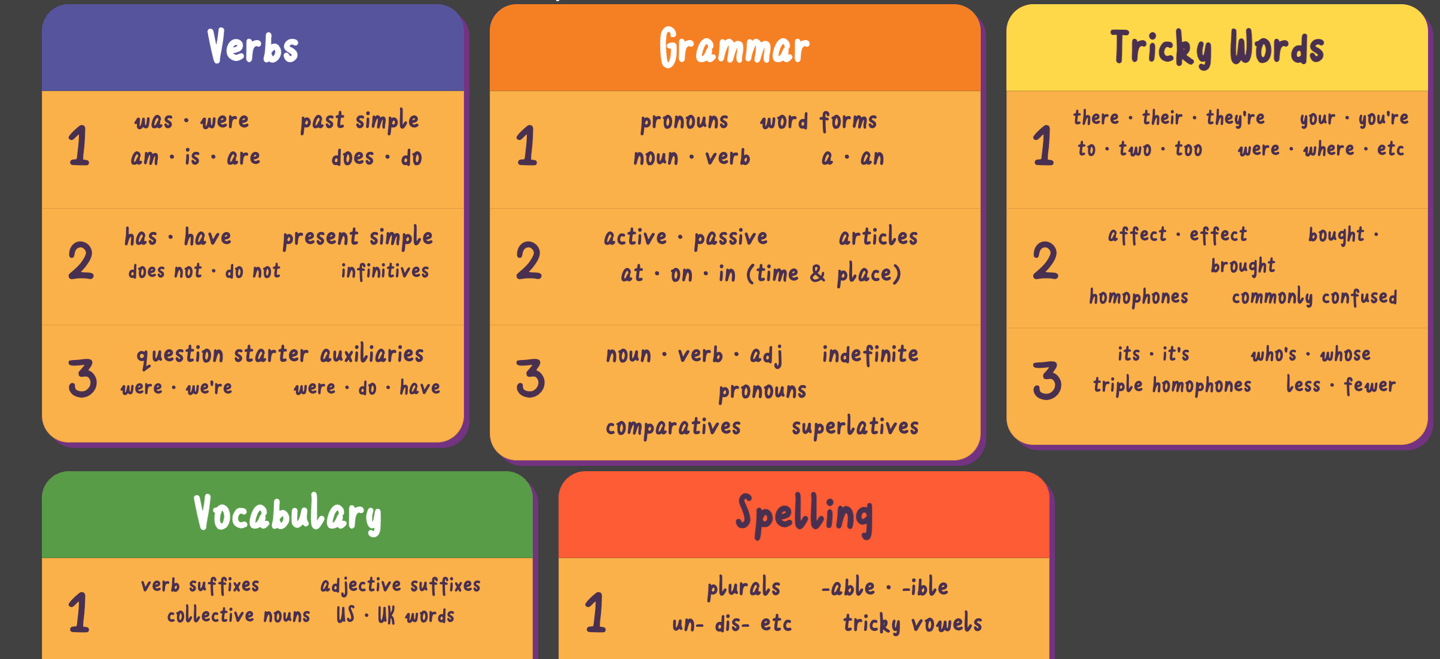 We have five SPAG categories of common skills and objectives which you can practise.