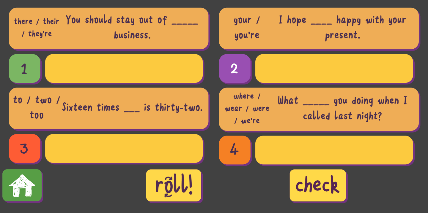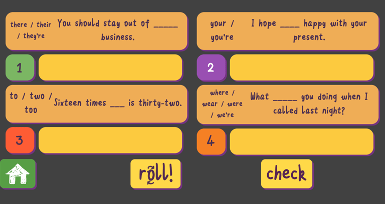 Click Check to see the answers, then Roll again for a new set.