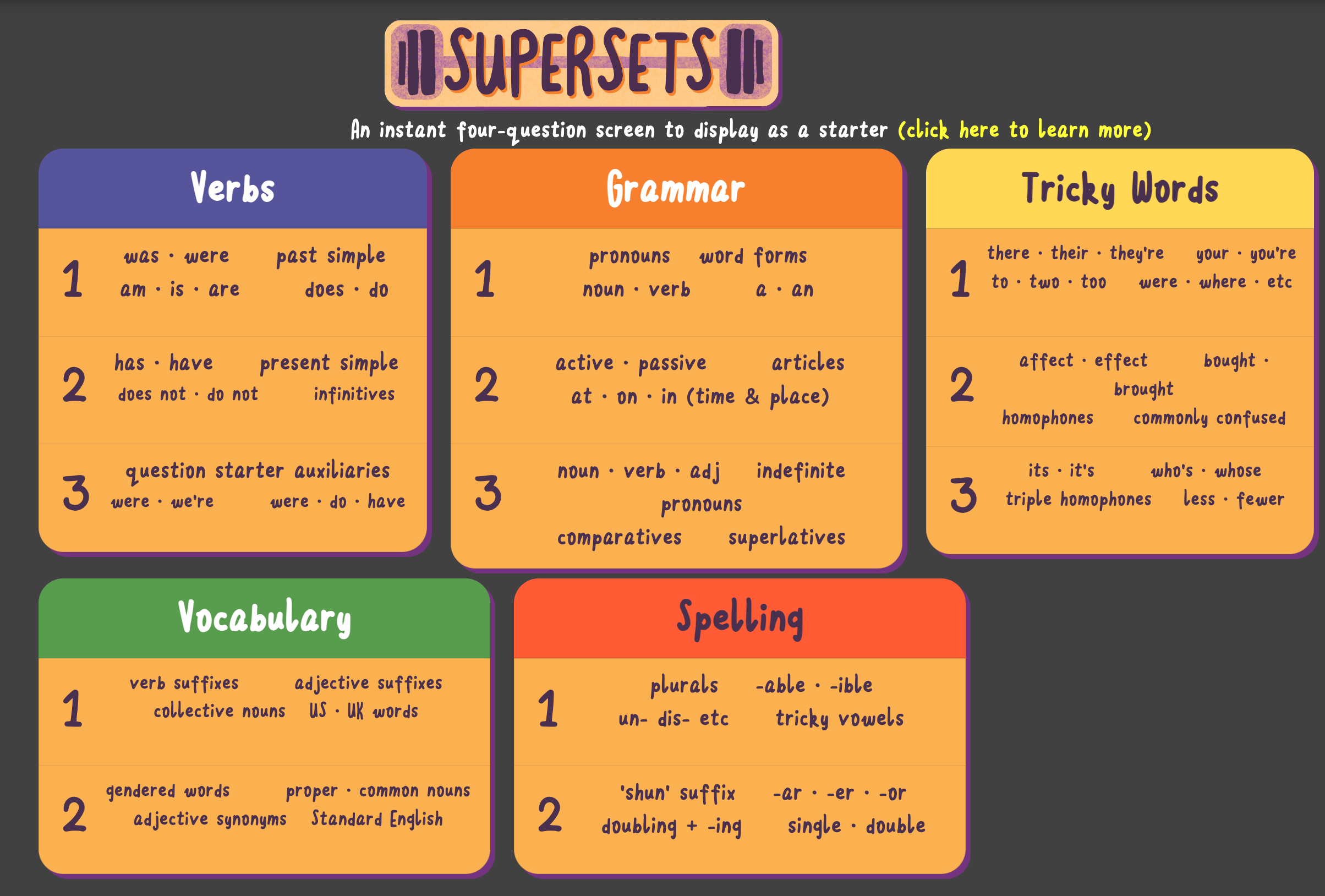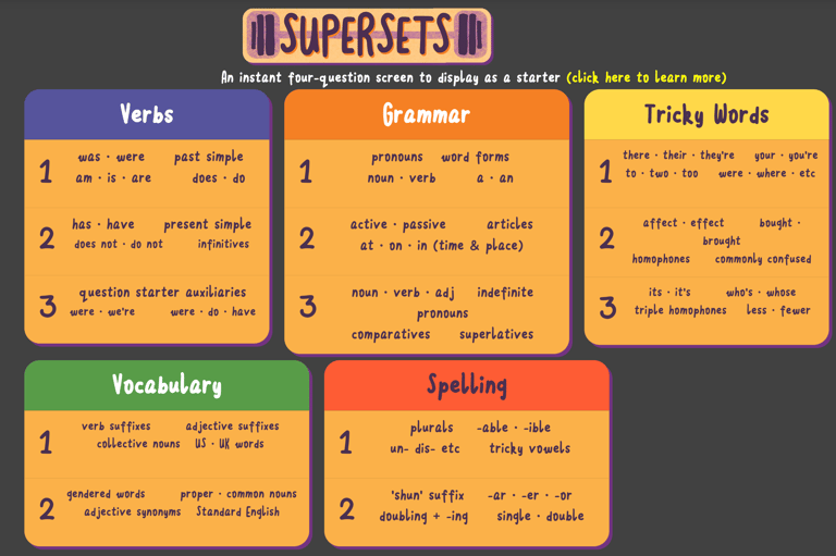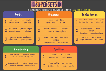 Supersets is our quick starter tool for displaying as a 'Do Now' / intro / warm-up exercise for all students.